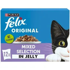 Bring variety and flavour to mealtimes with the Felix Original Mixed Selection in Jelly. This 12-pack includes a tasty assortment of recipes made with tender meaty or fishy chunks, served in a rich, irresistible jelly that cats love.