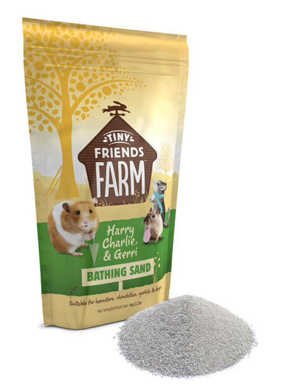 Tiny friends farm bathing sand in a high sided tray. Chinchillas will enjoy a sand bath everyday. Whilst hamsters, gerbils and degus prefer to bathe two or three times a week.